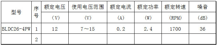 通用規(guī)格 材質(zhì) 底座:塑料(黑色)UL94V-0 扇葉:塑料(黑色)UL94V-0 軸承:含油軸承(采用專(zhuān)利自鎖油循環(huán)系統(tǒng)保證軸與軸承長(zhǎng)期潤(rùn)滑運(yùn)轉(zhuǎn),避免缺油) 油:P2A090(普瑪威克) 導(dǎo)線(xiàn):UL1007 22AWG、24AWG+,紅;-,黑 連接器:可根據(jù)用戶(hù)需要定制